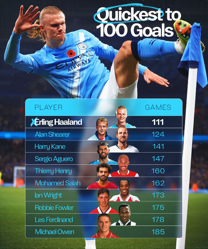 - 엘링 홀란: 111경기 100골 (경기당 약 0.90골)