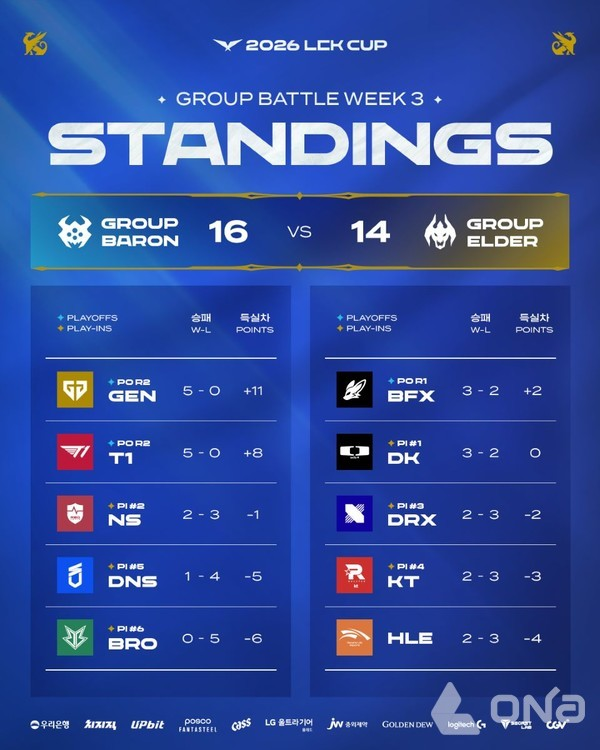 이번 2026 LCK컵 그룹 배틀의 가장 큰 특징은 바론 그룹의 압도적 우위였습니다. 슈퍼위크 결과, 바론 그룹에 속한 5개 팀(T1, 젠지, 농심 레드포스, DN SOOP, 한진 브리온)이 모두 상위 라운드 진출에 성공하는 기염을 토했습니다. 반면 장로 그룹은 한화생명을 포함한 대다수 팀이 고전을 면치 못했습니다.