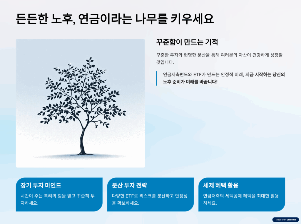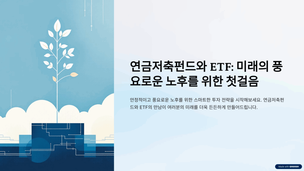 연금저축펀드 ETF는 미래를 위한 가장 스마트한 투자 방법 중 하나입니다. 복잡하게 느껴졌던 ETF 투자를 연금저축펀드라는 큰 틀 안에서 시작한다면, 세제 혜택과 함께 장기적인 자산 증식이라는 두 마리 토끼를 모두 잡을 수 있습니다. 오늘 이 글을 통해 연금저축펀드 ETF에 대한 궁금증이 해소되고, 여러분의 든든한 노후를 위한 첫걸음을 내딛는 계기가 되기를 바랍니다. 지금 바로 소액부터 시작해 보시는 것은 어떨까요?