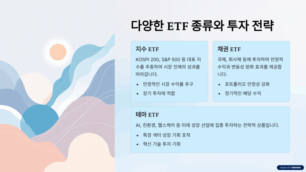 초심자라면 ‘핵심 자산 + 보조 자산’ 조합을 고려해 보세요. 예를 들어, 전체 투자금의 70%는 S&P 500 ETF와 같은 안정적인 시장 추종형에, 나머지 30%는 채권 ETF 또는 선호하는 테마 ETF에 배분하는 방식입니다. 이는 위험을 분산시키면서도 꾸준한 성장을 추구하는 데 도움이 됩니다.