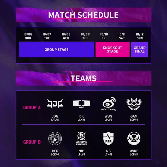 - 그룹 스테이지: 10월 6일 ~ 10월 9일 (4일간, Bo3 단판 풀리그)