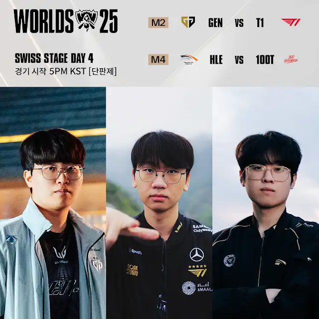 2025 LOL WORLDS 스위스 스테이지 4일차 경기는 10월 18일(토)에 진행될 예정이며, 한국 시간 기준으로 오후 5시(17:00 KST)에 시작됩니다. 4일차에는 1승 1패 팀들의 매치업이 대결합니다. 특히 LCK 팬들이 주목해야 할 매치업이 있습니다.