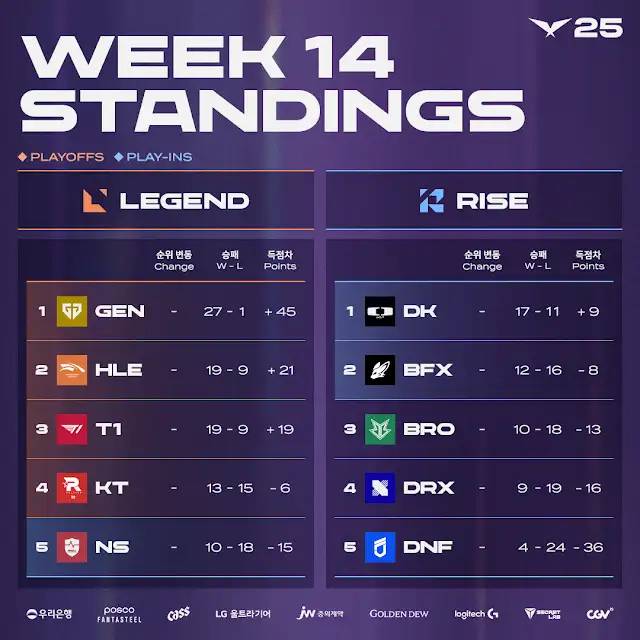 위 순위는 14주차까지의 잠정적인 결과이며, 15주차 경기에 따라 최종 플레이오프 진출팀과 순위가 확정됩니다. 플레이오프 시드 배정이 팀의 우승 가능성에 큰 영향을 미치는 만큼, 남은 경기 결과에 따라 순위표는 또다시 큰 변동을 겪을 수 있습니다.