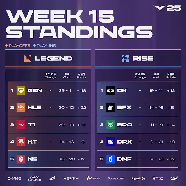 5위부터 10위까지의 팀들은 치열한 순위 싸움을 벌였습니다. 라이즈 그룹(6~10위)과 레전드 그룹(1~5위)의 성적에 따라 플레이인 진출 팀이 결정되었는데, 디플러스 기아, BNK 피어엑스, 농심 레드포스, OK저축은행 브리온이 최종 플레이인 진출을 확정했습니다. 이들은 플레이인을 거쳐 플레이오프 진출 마지막 두 자리를 놓고 경쟁하게 됩니다.