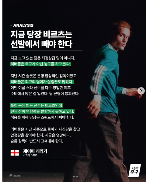 반면, 리버풀은 공격진의 부진이 뼈아팠습니다. 공격의 핵심 선수들이 상대 수비에 막히면서 개인 기량으로 경기를 풀어가는 데 한계를 드러냈습니다. 상대의 거친 압박에 당황한 듯, 평소의 날카로운 패스와 유기적인 움직임이 제대로 나오지 않았습니다. 경기를 지배했음에도 불구하고 골을 만들어내지 못하는 답답한 흐름이 계속되면서 결국 패배의 빌미를 제공했습니다.