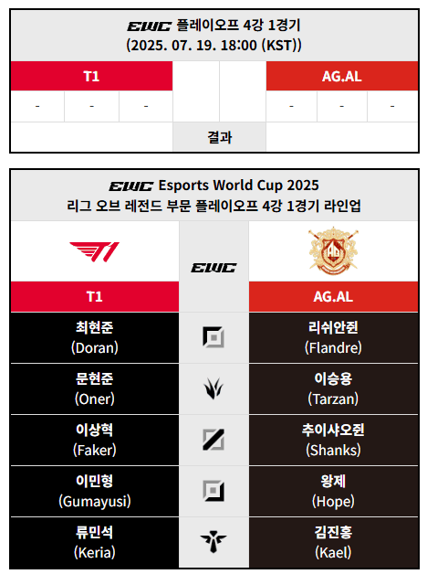 - 첫 번째 경기: T1 vs AG.AL(Anyone’s Legend) – 오후 6시(KST)